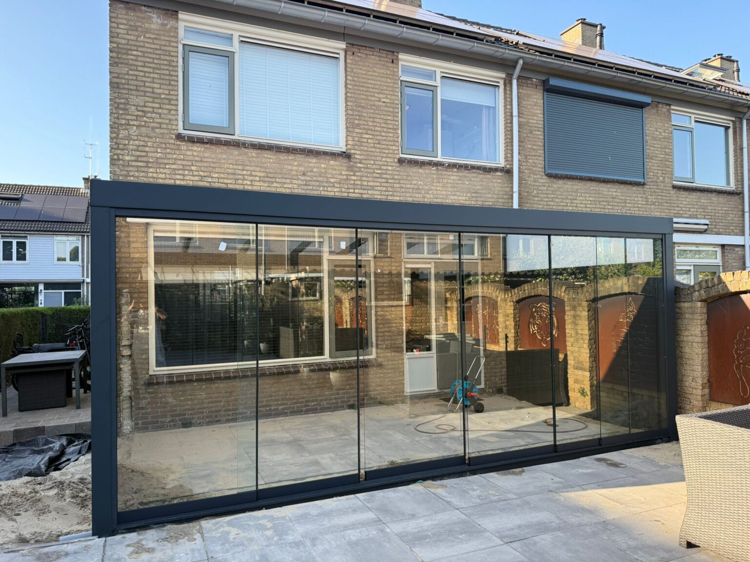 Glazen wanden geven uw veranda een luxe uitstraling en laten veel licht door. Ze beschermen tegen wind en regen en maken de ruimte het hele jaar bruikbaar.